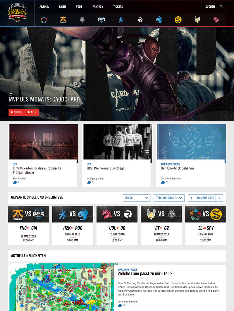 To give our players a truly regional experience, my team launched a brand new esports website for EU. Content is uniquely created for each language and the CMS features an advanced layout system. The branding is light and sporty to give esports it’s well deserved placement among other European sports brands.