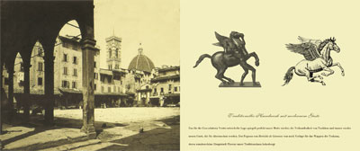 The logo I developed for them recalls associations with »tradition and quality«. It contains the emblem of Tuscany, a pegasus. Corporate Identity Design (logo development / business cards / promotional items) · Package Design · Product Catalogue & Leporellos